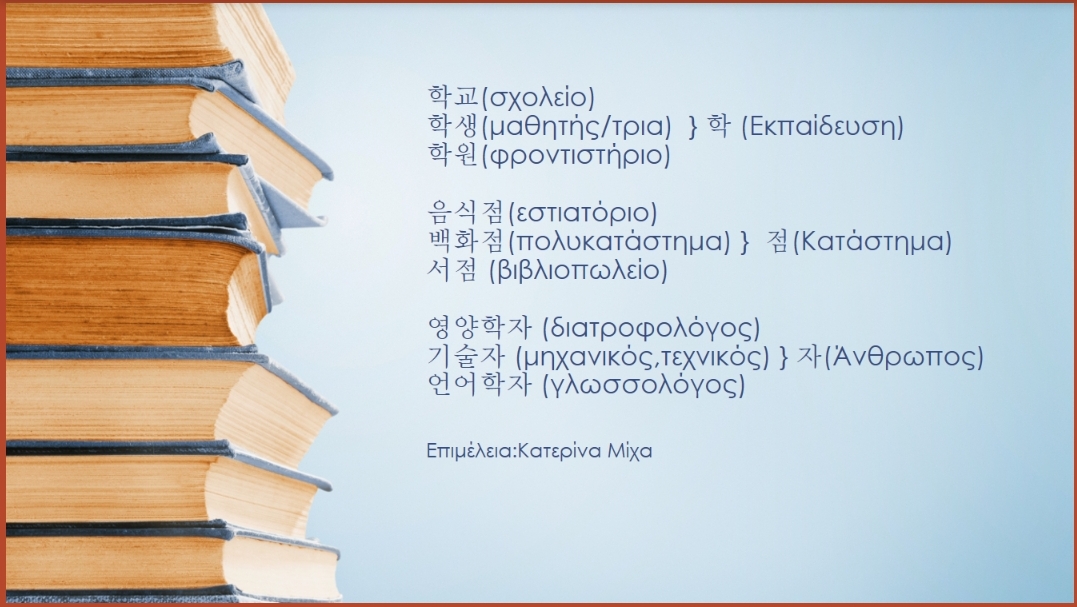 Αν παρατηρήσουμε προσεκτικά λέξεις των κορεατικών και κυρίως λέξεις που έχουν κινέζικη ρίζα θα διαπιστώσουμε ότι υπάρχουν κάποια μοτίβα που επαναλαμβάνονται και μας βοηθούν στην καλύτερη απομνημόνευση του λεξιλογίου. Π.χ. λέξεις που εμπεριέχουν το συνθετικό 학(χακ) έχουν να κάνουν με το χώρο της μάθησης και εκπαίδευσης 학생(μαθητής) , 학교(σχολείο), 학원(φροντιστήριο).
